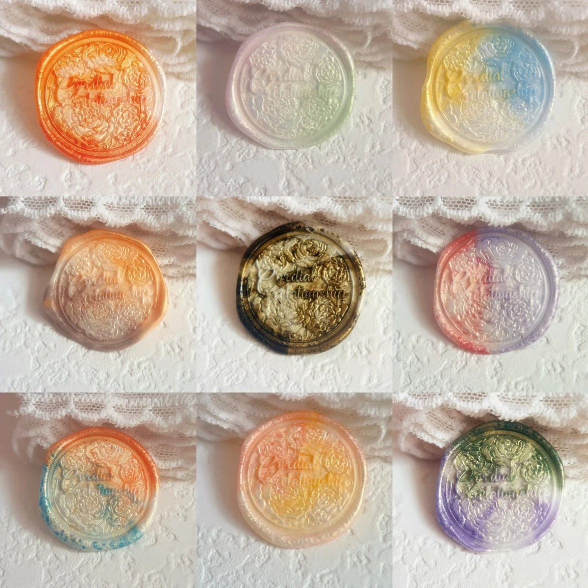 バタフライふた色サンド 外側は白金色、中身はランダムな2色のシーリングワックスです。